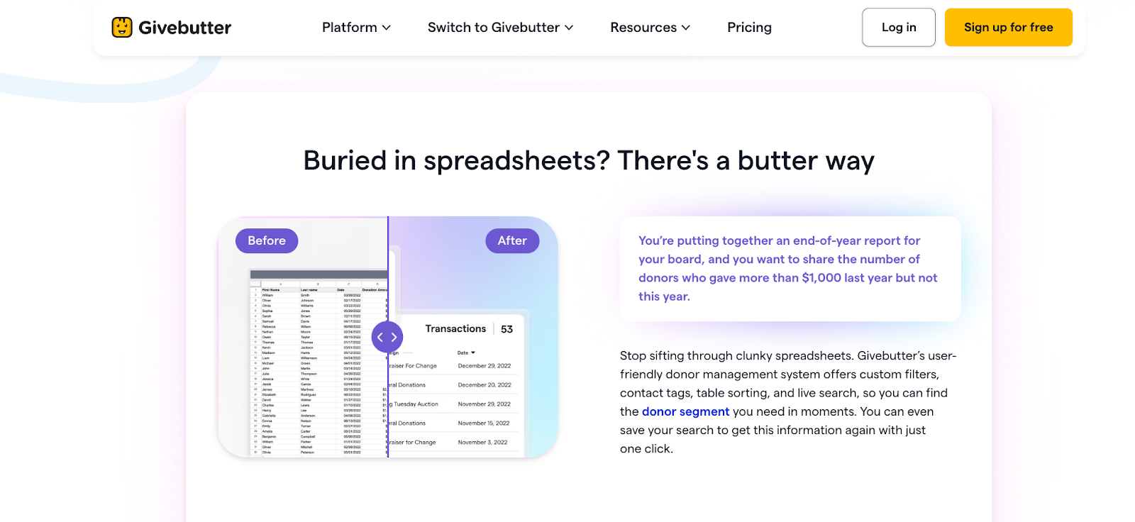 Givebutter is a great choice for small nonprofits. It's an affordable but robust option that offers CRM and fundraising functionality.